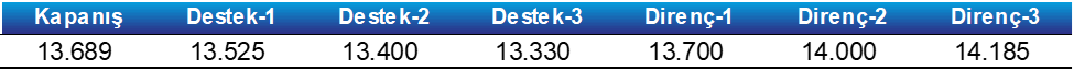 - Teknik açıdan bakıldığında, yukarı yönlü hareketlerde daha önce yatay direnç olarak çalışan 13.700 seviyesini takip edeceğiz. Bu direnç bölgesinin aşılması halinde pozitif görünüm korunabilir ve 14.000 seviyesi gündeme gelebilir.