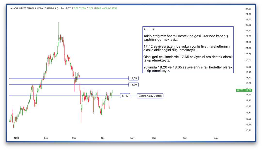 Takip ettiğimiz önemli destek bölgesi üzerinde kapanış yaptığını görmekteyiz. 17.42 seviyesi üzerinde yukarı yönlü fiyat hareketlerinin olası olabileceğini düşünmekteyiz. Olası geri çekilmelerde 17.65 seviyesini ara destek olarak takip etmekteyiz. Yukarıda 18.20 ve 18.65 seviyelerini sıralı hedefler olarak takip etmekteyiz.