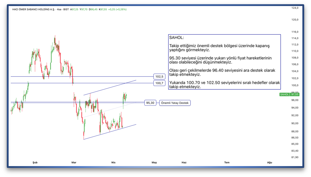 Takip ettiğimiz önemli destek bölgesi üzerinde kapanış yaptığını görmekteyiz. 95.30 seviyesi üzerinde yukarı yönlü fiyat hareketlerinin olası olabileceğini düşünmekteyiz. Olası geri çekilmelerde 96.40 seviyesini ara destek olarak takip etmekteyiz. Yukarıda 100.70 ve 102.50 seviyelerini sıralı hedefler olarak takip etmekteyiz.