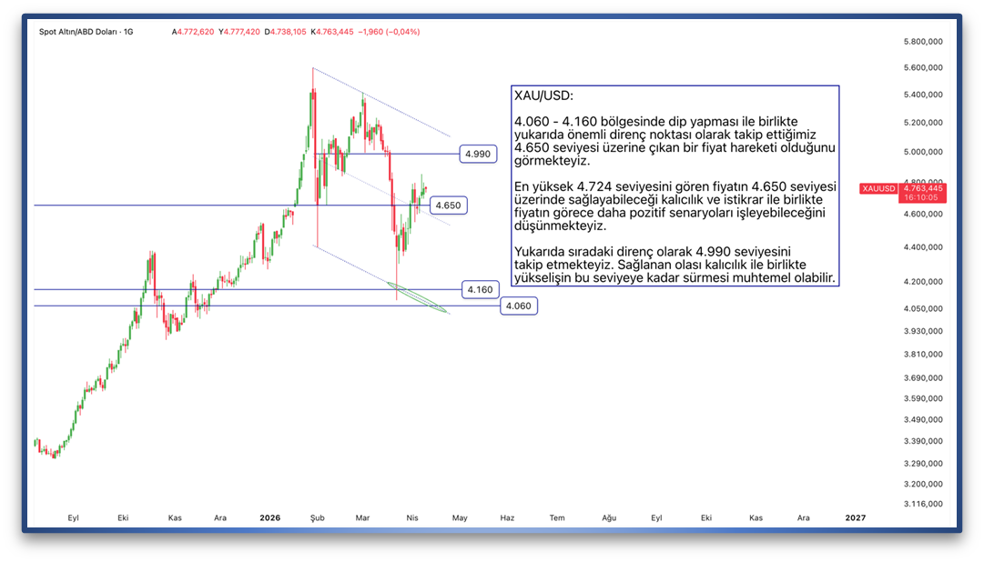 4.060 - 4.160 bölgesinde dip yapması ile birlikte yukarıda önemli direnç noktası olarak takip ettiğimiz 4.650 seviyesi üzerine çıkan bir fiyat hareketi olduğunu görmekteyiz. En yüksek 4.724 seviyesini gören fiyatın 4.650 seviyesi üzerinde sağlayabileceği kalıcılık ve istikrar ile birlikte fiyatın görece daha pozitif senaryoları işleyebileceğini düşünmekteyiz. Yukarıda sıradaki direnç olarak 4.990 seviyesini takip etmekteyiz. Sağlanan olası kalıcılık ile birlikte yükselişin bu seviyeye kadar sürmesi muhtemel olabilir.