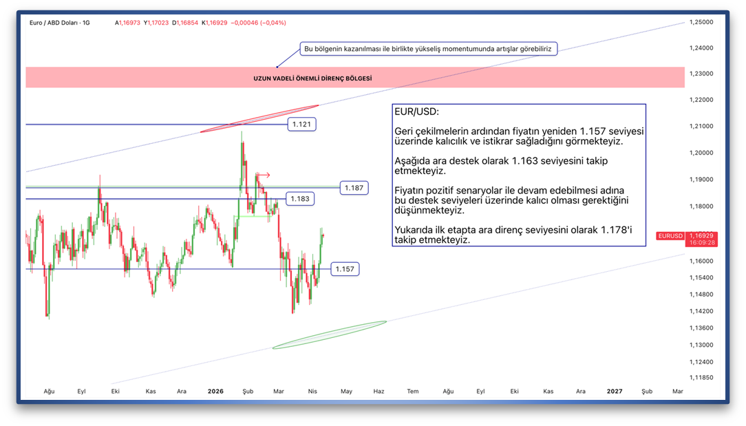 Geri çekilmelerin ardından fiyatın yeniden 1.157 seviyesi üzerinde kalıcılık ve istikrar sağladığını görmekteyiz. Aşağıda ara destek olarak 1.163 seviyesini takip etmekteyiz. Fiyatın pozitif senaryolar ile devam edebilmesi adına bu destek seviyeleri üzerinde kalıcı olması gerektiğini düşünmekteyiz. Yukarıda ilk etapta ara direnç seviyesini olarak 1.178'i takip etmekteyiz.