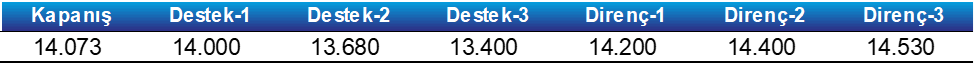 - Öte yandan, endeksin 14.000 seviyesinin altında kapanışlar yapması halinde geri çekilme hareketi görülebilir. Bu durumda 13.680 seviyesini destek olarak izliyor olacağız.