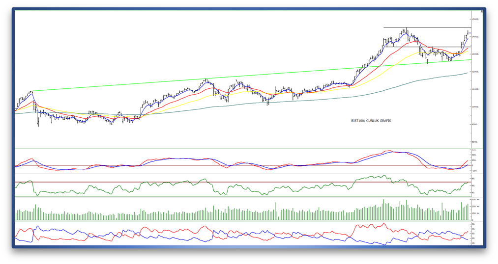- Geri çekilmelerde 14.000 seviyesini destek olarak izliyoruz. Bu seviyenin altında ise kısa vadeli görünüm açısından takip ettiğimiz 5 günlük üssel hareketli ortalamanın bulunduğu 13.890 civarı, destek konumunda öne çıkıyor.