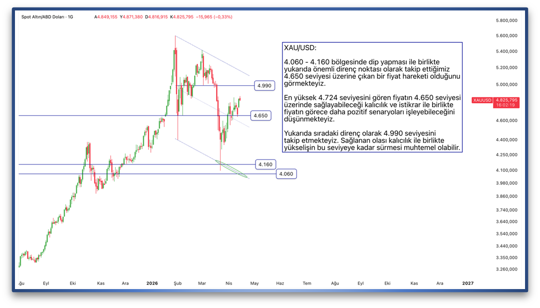 4.060 - 4.160 bölgesinde dip yapması ile birlikte yukarıda önemli direnç noktası olarak takip ettiğimiz 4.650 seviyesi üzerine çıkan bir fiyat hareketi olduğunu görmekteyiz. En yüksek 4.724 seviyesini gören fiyatın 4.650 seviyesi üzerinde sağlayabileceği kalıcılık ve istikrar ile birlikte fiyatın görece daha pozitif senaryoları işleyebileceğini düşünmekteyiz. Yukarıda sıradaki direnç olarak 4.990 seviyesini takip etmekteyiz. Sağlanan olası kalıcılık ile birlikte yükselişin bu seviyeye kadar sürmesi muhtemel olabilir.