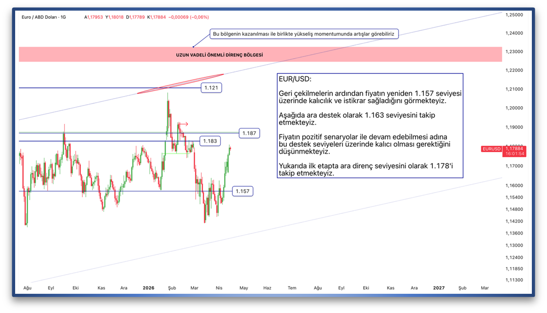 Geri çekilmelerin ardından fiyatın yeniden 1.157 seviyesi üzerinde kalıcılık ve istikrar sağladığını görmekteyiz. Aşağıda ara destek olarak 1.163 seviyesini takip etmekteyiz. Fiyatın pozitif senaryolar ile devam edebilmesi adına bu destek seviyeleri üzerinde kalıcı olması gerektiğini düşünmekteyiz. Yukarıda ilk etapta ara direnç seviyesini olarak 1.178'i takip etmekteyiz.