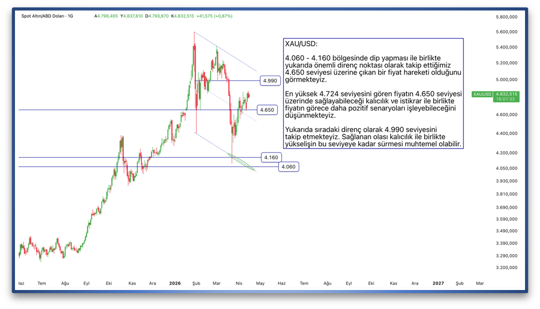 4.060 - 4.160 bölgesinde dip yapması ile birlikte yukarıda önemli direnç noktası olarak takip ettiğimiz 4.650 seviyesi üzerine çıkan bir fiyat hareketi olduğunu görmekteyiz. En yüksek 4.724 seviyesini gören fiyatın 4.650 seviyesi üzerinde sağlayabileceği kalıcılık ve istikrar ile birlikte fiyatın görece daha pozitif senaryoları işleyebileceğini düşünmekteyiz. Yukarıda sıradaki direnç olarak 4.990 seviyesini takip etmekteyiz. Sağlanan olası kalıcılık ile birlikte yükselişin bu seviyeye kadar sürmesi muhtemel olabilir.