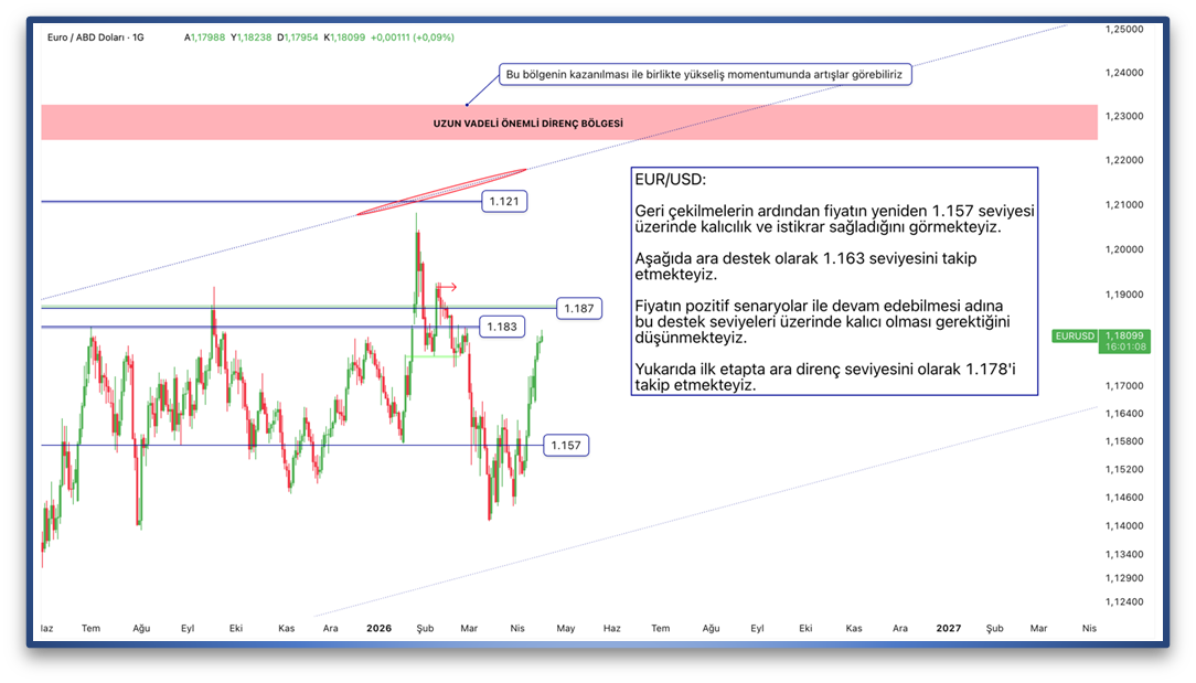 Geri çekilmelerin ardından fiyatın yeniden 1.157 seviyesi üzerinde kalıcılık ve istikrar sağladığını görmekteyiz. Aşağıda ara destek olarak 1.163 seviyesini takip etmekteyiz. Fiyatın pozitif senaryolar ile devam edebilmesi adına bu destek seviyeleri üzerinde kalıcı olması gerektiğini düşünmekteyiz. Yukarıda ilk etapta ara direnç seviyesini olarak 1.178'i takip etmekteyiz.