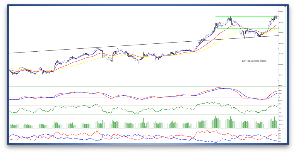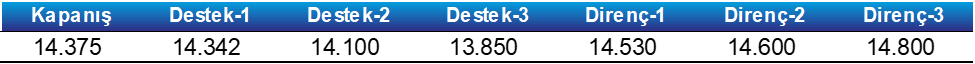 - Olası geri çekilmelerde ise kısa vadeli görünüm açısından izlediğimiz 14.342 seviyesi, yani 5 günlük üssel hareketli ortalama, ilk destek bölgesi olarak öne çıkıyor. Bu seviyenin altında kalıcılık sağlanması halinde, daha önce destek olarak test edilen 14.100 seviyelerine doğru bir geri çekilme yaşanabilir.