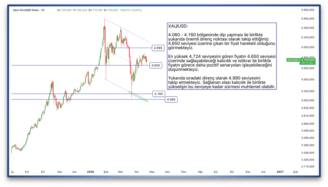 4.060 - 4.160 bölgesinde dip yapması ile birlikte yukarıda önemli direnç noktası olarak takip ettiğimiz 4.650 seviyesi üzerine çıkan bir fiyat hareketi olduğunu görmekteyiz. En yüksek 4.724 seviyesini gören fiyatın 4.650 seviyesi üzerinde sağlayabileceği kalıcılık ve istikrar ile birlikte fiyatın görece daha pozitif senaryoları işleyebileceğini düşünmekteyiz. Yukarıda sıradaki direnç olarak 4.990 seviyesini takip etmekteyiz. Sağlanan olası kalıcılık ile birlikte yükselişin bu seviyeye kadar sürmesi muhtemel olabilir.