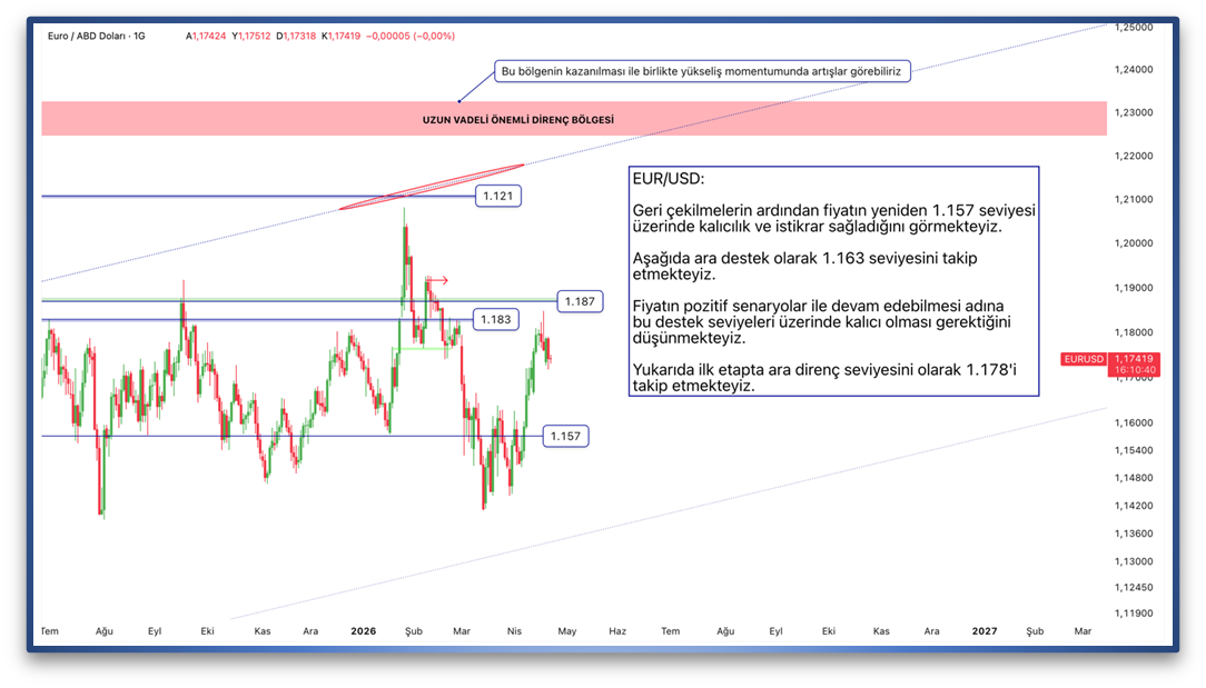 Geri çekilmelerin ardından fiyatın yeniden 1.157 seviyesi üzerinde kalıcılık ve istikrar sağladığını görmekteyiz. Aşağıda ara destek olarak 1.163 seviyesini takip etmekteyiz. Fiyatın pozitif senaryolar ile devam edebilmesi adına bu destek seviyeleri üzerinde kalıcı olması gerektiğini düşünmekteyiz. Yukarıda ilk etapta ara direnç seviyesini olarak 1.178'i takip etmekteyiz.