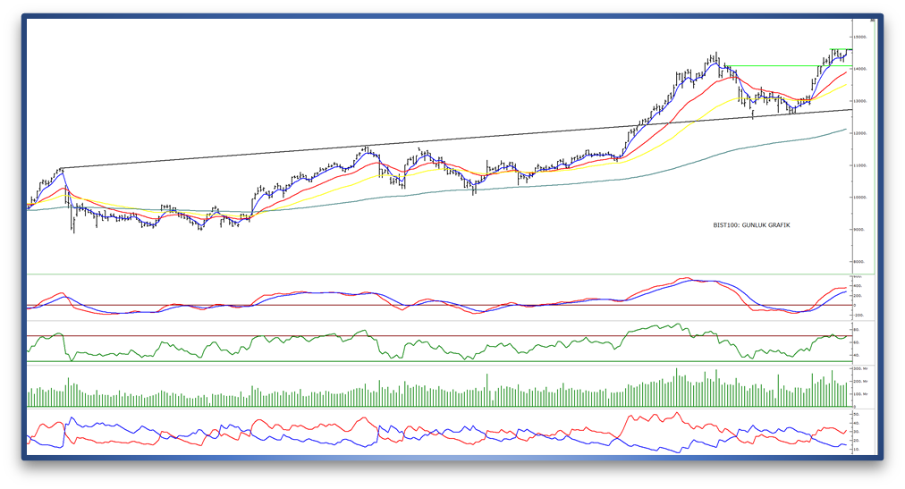- Endeksi teknik açıdan değerlendirdiğimizde, kısa vadede 14.620 seviyesini direnç bölgesi olarak takip ediyoruz. Yukarı yönlü hareketlerin devamı için bu seviyenin üzerinde kapanışlar gerçekleşmesi gerektiğini düşünüyoruz. Bu senaryoda iyimser görünüm devam edebilir ve 14.800 seviyesi hedeflenebilir.