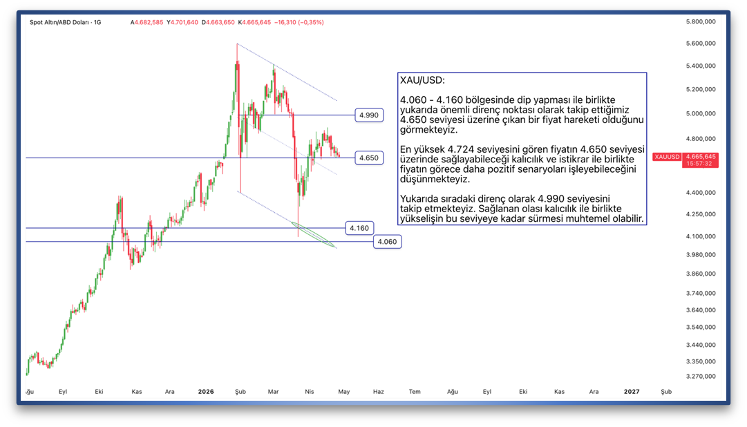 4.060 - 4.160 bölgesinde dip yapması ile birlikte yukarıda önemli direnç noktası olarak takip ettiğimiz 4.650 seviyesi üzerine çıkan bir fiyat hareketi olduğunu görmekteyiz. En yüksek 4.724 seviyesini gören fiyatın 4.650 seviyesi üzerinde sağlayabileceği kalıcılık ve istikrar ile birlikte fiyatın görece daha pozitif senaryoları işleyebileceğini düşünmekteyiz. Yukarıda sıradaki direnç olarak 4.990 seviyesini takip etmekteyiz. Sağlanan olası kalıcılık ile birlikte yükselişin bu seviyeye kadar sürmesi muhtemel olabilir.
