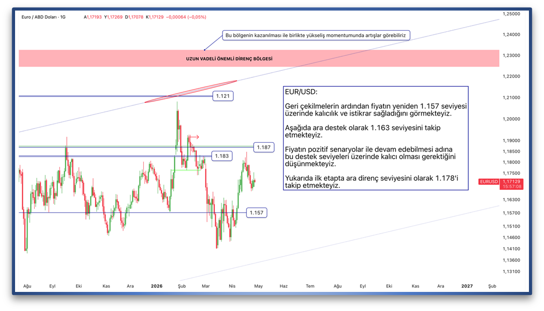 Geri çekilmelerin ardından fiyatın yeniden 1.157 seviyesi üzerinde kalıcılık ve istikrar sağladığını görmekteyiz. Aşağıda ara destek olarak 1.163 seviyesini takip etmekteyiz. Fiyatın pozitif senaryolar ile devam edebilmesi adına bu destek seviyeleri üzerinde kalıcı olması gerektiğini düşünmekteyiz. Yukarıda ilk etapta ara direnç seviyesini olarak 1.178'i takip etmekteyiz.