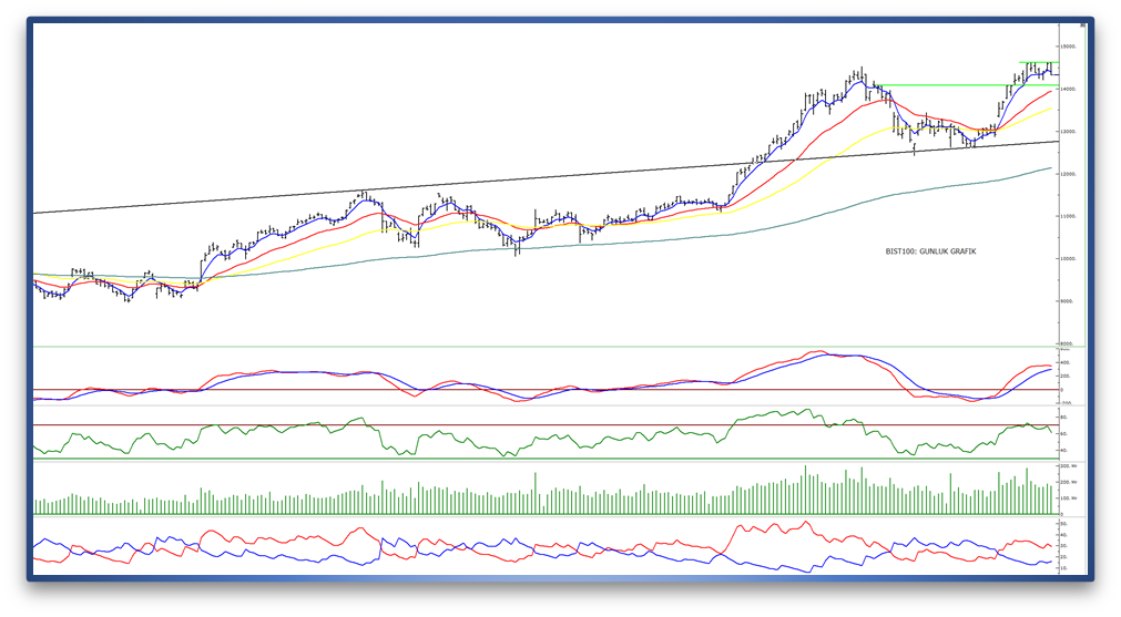 - Dün etkili olan satışlarla birlikte endeks, kısa vadeli yönde takip ettiğimiz 5 günlük üssel hareketli ortalama seviyesi olan 14.400 civarının altında günü tamamladı. Güçlenme hareketinin yeniden etkili olabilmesi için endeksin bu seviyenin üzerine çıkması gerektiğini düşünüyoruz. Bu durumda 14.600 direnç bölgesi yeniden gündeme gelebilir. Teknik açıdan 14.600 yatay direnç bölgesinin kırılması durumunda yükseliş ivmesinin artabileceğini öngörüyoruz.