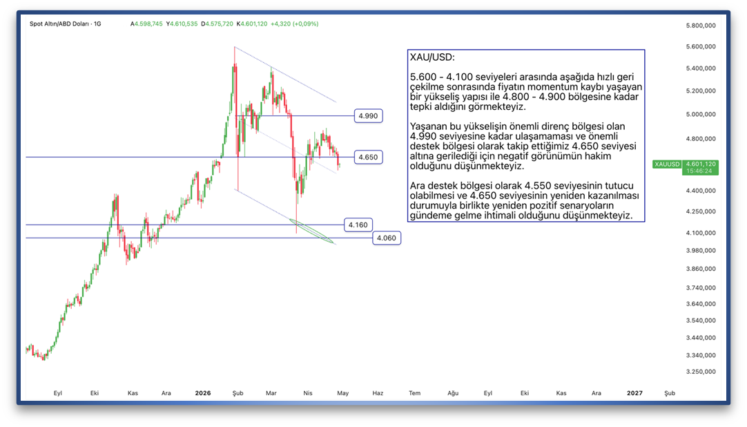 5.600 - 4.100 seviyeleri arasında aşağıda hızlı geri çekilme sonrasında fiyatın momentum kaybı yaşayan bir yükseliş yapısı ile 4.800 - 4.900 bölgesine kadar tepki aldığını görmekteyiz. Yaşanan bu yükselişin önemli direnç bölgesi olan 4.990 seviyesine kadar ulaşamaması ve önemli destek bölgesi olarak takip ettiğimiz 4.650 seviyesi altına gerilediği için negatif görünümün hakim olduğunu düşünmekteyiz. Ara destek bölgesi olarak 4.550 seviyesinin tutucu olabilmesi ve 4.650 seviyesinin yeniden kazanılması durumuyla birlikte yeniden pozitif senaryoların gündeme gelme ihtimali olduğunu düşünmekteyiz.