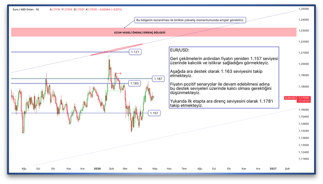 Geri çekilmelerin ardından fiyatın yeniden 1.157 seviyesi üzerinde kalıcılık ve istikrar sağladığını görmekteyiz. Aşağıda ara destek olarak 1.163 seviyesini takip etmekteyiz. Fiyatın pozitif senaryolar ile devam edebilmesi adına bu destek seviyeleri üzerinde kalıcı olması gerektiğini düşünmekteyiz. Yukarıda ilk etapta ara direnç seviyesini olarak 1.178'i takip etmekteyiz.