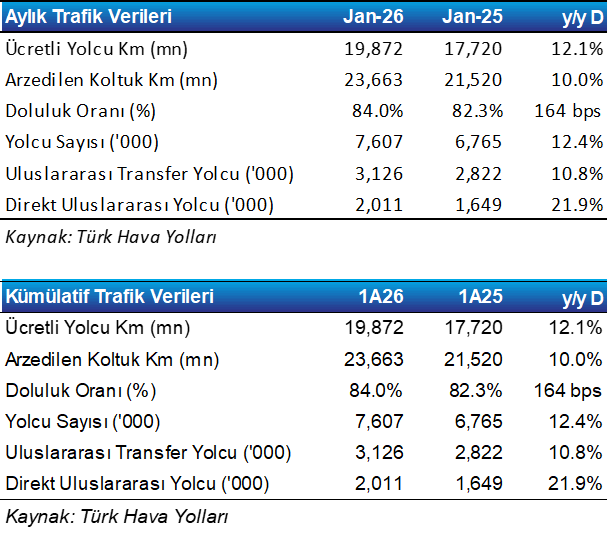 Toplam yolcu Ocak26'da bir önceki yıla göre %12,4 artış gösterdi. Yurt içi yolcu sayısı Ocak 2026'da y/y %7,6 artış göstererek 2,5 mn yolcu seviyesine ulaşırken, uluslararası yolcu sayısı Ocak 2026'da y/y %14,9 artarak 5,1 mn yolcu seviyesine ulaştı.