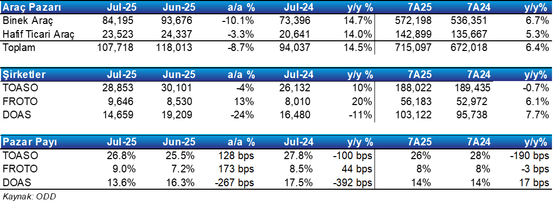 Otomotiv Distribütörleri Derneği’nin yayınladığı verilere göre Temmuz’25’te otomotiv ve hafif ticari araç pazarı yıllık bazda %14,5 artarak 107,718 adet seviyesine yükseldi. Binek araç pazarı yıllık bazda %14,7 artarken, HTA satışları yıllık bazda %14,0 artış gösterdi. Son 5 yılın ortalamasına göre kıyasladığımızda BA/HTA satışları 5 yıllık tarihsel satış ortalamalarının %29 üzerinde gerçekleşti.