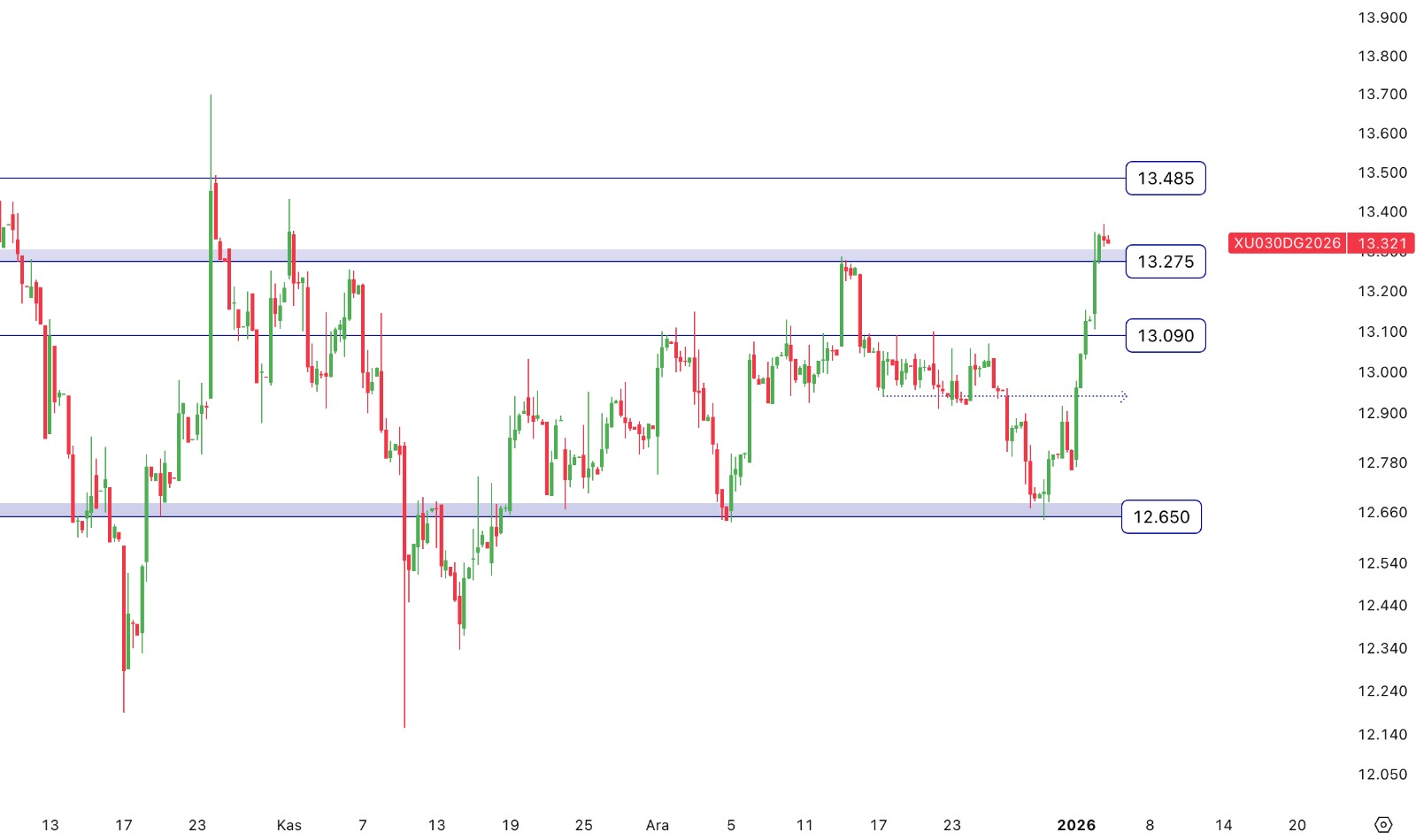 - Şubat Vade Endeks Sözleşmesi 106.00 – 13,369.00 aralığında hareket ettiği günü %1.75 değer kazancıyla 13.320.00 puan seviyesinden tamamladı.