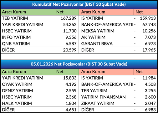 - Şubat Vade Endeks Sözleşmesinde önceki işlemde gününde gerçekleşen işlemlerde ilk 5 kurum bazında nette 2.332 adet alış gerçekleşirken, kümülatif net pozisyonlar tarafında ilk 5 kurum bazında 2.634 adet fark ile satışların baskın olduğunu, önceki güne göre ilk 5 kurum bazında farkın satıcılar lehine arttığını gözlemliyoruz. Bir önceki gün ilk 5 kurum bazında fark 953 adet alıcılar lehineydi.