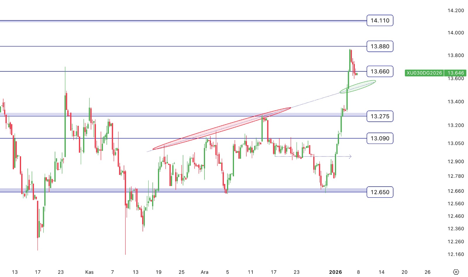 - Teknik olarak değerlendirecek olursak; Şubat Vade Endeks Sözleşmesinin 5 ve 22 günlük ortalamaların üzerinde kapanış gerçekleştirdiğini izliyoruz. Sözleşmede kısa vadeli teknik göstergelerin alış yönünde sinyaller verdiğini görüyoruz. Alıcılı seyrin devam etmesi halinde sırasıyla 13.660 ve 13.880 direnç olarak takip edilebilir. Gün içi olası geri çekilmelerde 13.550 ve 13.500 destek olarak takip edilebilir.