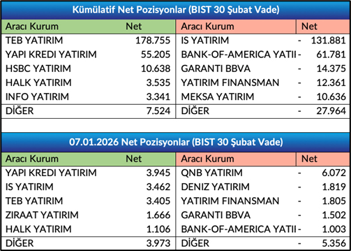 - Şubat Vade Endeks Sözleşmesinde önceki işlemde gününde gerçekleşen işlemlerde ilk 5 kurum bazında nette 1.383 adet alış gerçekleşirken, kümülatif net pozisyonlar tarafında ilk 5 kurum bazında 20.440 adet fark ile alışların baskın olduğunu, önceki güne göre ilk 5 kurum bazında farkın alıcılar lehine arttığını gözlemliyoruz. Bir önceki gün ilk 5 kurum bazında fark 14.170 adet alıcılar lehineydi.