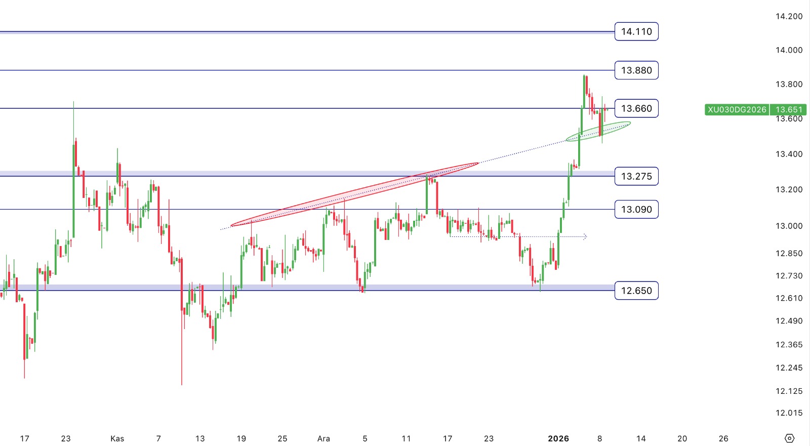 - Teknik olarak değerlendirecek olursak; Şubat Vade Endeks Sözleşmesinin 5 ve 22 günlük ortalamaların üzerinde kapanış gerçekleştirdiğini izliyoruz. Sözleşmede kısa vadeli teknik göstergelerin alış yönünde sinyaller verdiğini görüyoruz. Alıcılı seyrin devam etmesi halinde sırasıyla 13.660 ve 13.880 direnç olarak takip edilebilir. Gün içi olası geri çekilmelerde 13.550 ve 13.500 destek olarak takip edilebilir.