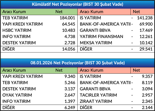 - Şubat Vade Endeks Sözleşmesinde önceki işlemde gününde gerçekleşen işlemlerde ilk 5 kurum bazında nette 4.105 adet satış gerçekleşirken, kümülatif net pozisyonlar tarafında ilk 5 kurum bazında 15.485 adet fark ile alışların baskın olduğunu, önceki güne göre ilk 5 kurum bazında farkın alıcılar lehine azaldığını gözlemliyoruz. Bir önceki gün ilk 5 kurum bazında fark 20.440 adet alıcılar lehineydi.