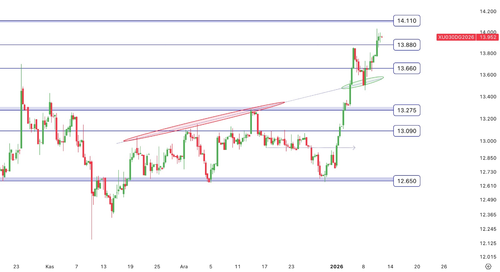 - Teknik olarak değerlendirecek olursak; Şubat Vade Endeks Sözleşmesinin 5 ve 22 günlük ortalamaların üzerinde kapanış gerçekleştirdiğini izliyoruz. Sözleşmede kısa vadeli teknik göstergelerin alış yönünde sinyaller verdiğini görüyoruz. Alıcılı seyrin devam etmesi halinde sırasıyla 14.000 ve 14.110 direnç olarak takip edilebilir. Gün içi olası geri çekilmelerde 13.880 ve 13.660 destek olarak takip edilebilir.