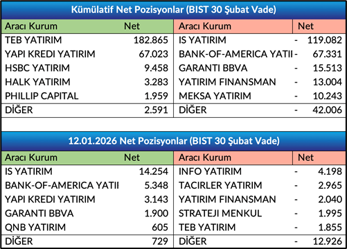 - Şubat Vade Endeks Sözleşmesinde önceki işlemde gününde gerçekleşen işlemlerde ilk 5 kurum bazında nette 12.197 adet alış gerçekleşirken, kümülatif net pozisyonlar tarafında ilk 5 kurum bazında 39.415 adet fark ile alışların baskın olduğunu, önceki güne göre ilk 5 kurum bazında farkın alıcılar lehine arttığını gözlemliyoruz. Bir önceki gün ilk 5 kurum bazında fark 22.542 adet alıcılar lehineydi.