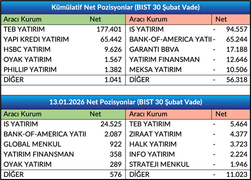 - Şubat Vade Endeks Sözleşmesinde önceki işlemde gününde gerçekleşen işlemlerde ilk 5 kurum bazında nette 10.447 adet alış gerçekleşirken, kümülatif net pozisyonlar tarafında ilk 5 kurum bazında 55.277 adet fark ile alışların baskın olduğunu, önceki güne göre ilk 5 kurum bazında farkın alıcılar lehine arttığını gözlemliyoruz. Bir önceki gün ilk 5 kurum bazında fark 39.415 adet alıcılar lehineydi.
