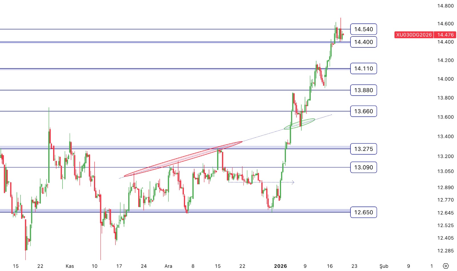 - Teknik olarak değerlendirecek olursak; Şubat Vade Endeks Sözleşmesinin 5 ve 22 günlük ortalamaların üzerinde kapanış gerçekleştirdiğini izliyoruz. Sözleşmede kısa vadeli teknik göstergelerin alış yönünde sinyaller verdiğini görüyoruz. Alıcılı seyrin devam etmesi halinde sırasıyla 14.540 ve 14.650 direnç olarak takip edilebilir. Gün içi olası geri çekilmelerde 14.400 ve 14.250 destek olarak takip edilebilir.