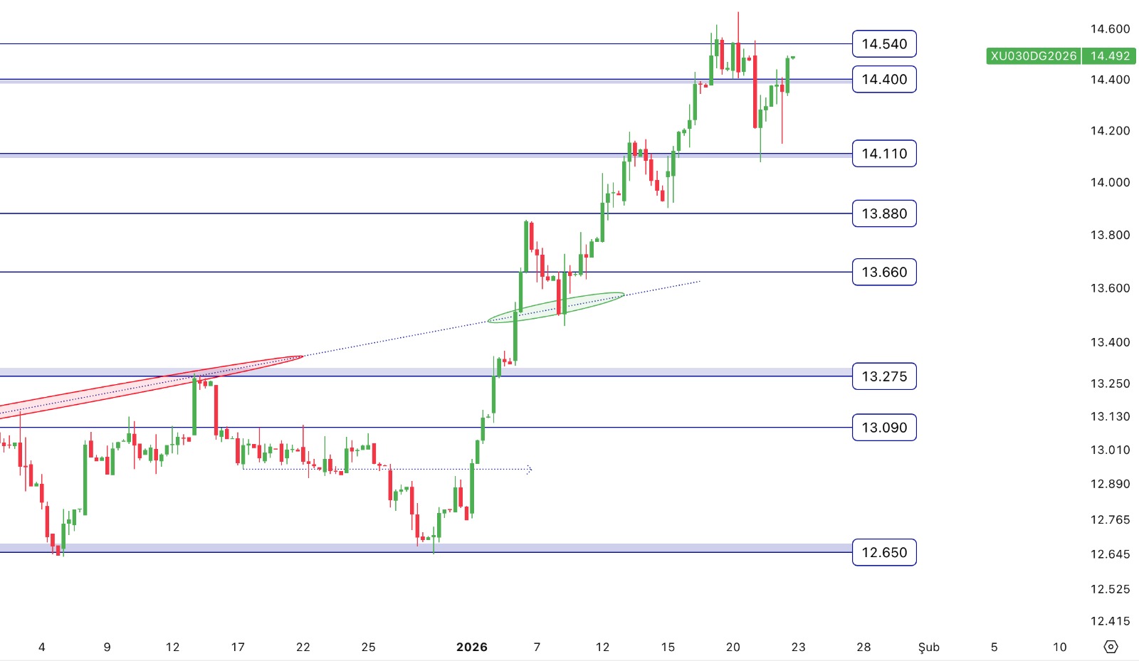 - Teknik olarak değerlendirecek olursak; Şubat Vade Endeks Sözleşmesinin 5 ve 22 günlük ortalamaların üzerinde kapanış gerçekleştirdiğini izliyoruz. Sözleşmede kısa vadeli teknik göstergelerin alış yönünde sinyaller verdiğini görüyoruz. Alıcılı seyrin devam etmesi halinde sırasıyla 14.540 ve 14.650 direnç olarak takip edilebilir. Gün içi olası geri çekilmelerde 14.400 ve 14.250 destek olarak takip edilebilir.