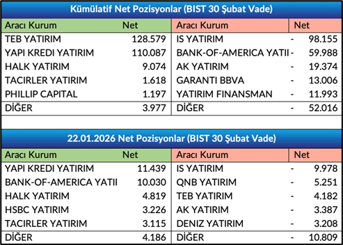 - Şubat Vade Endeks Sözleşmesinde önceki işlem gününde gerçekleşen işlemlerde ilk 5 kurum bazında nette 6.623 adet alış gerçekleşirken, kümülatif net pozisyonlar tarafında ilk 5 kurum bazında 48.039 adet fark ile alışların baskın olduğunu, önceki güne göre ilk 5 kurum bazında farkın alıcılar lehine arttığını gözlemliyoruz. Bir önceki gün ilk 5 kurum bazında fark 40.513 adet alıcılar lehineydi.