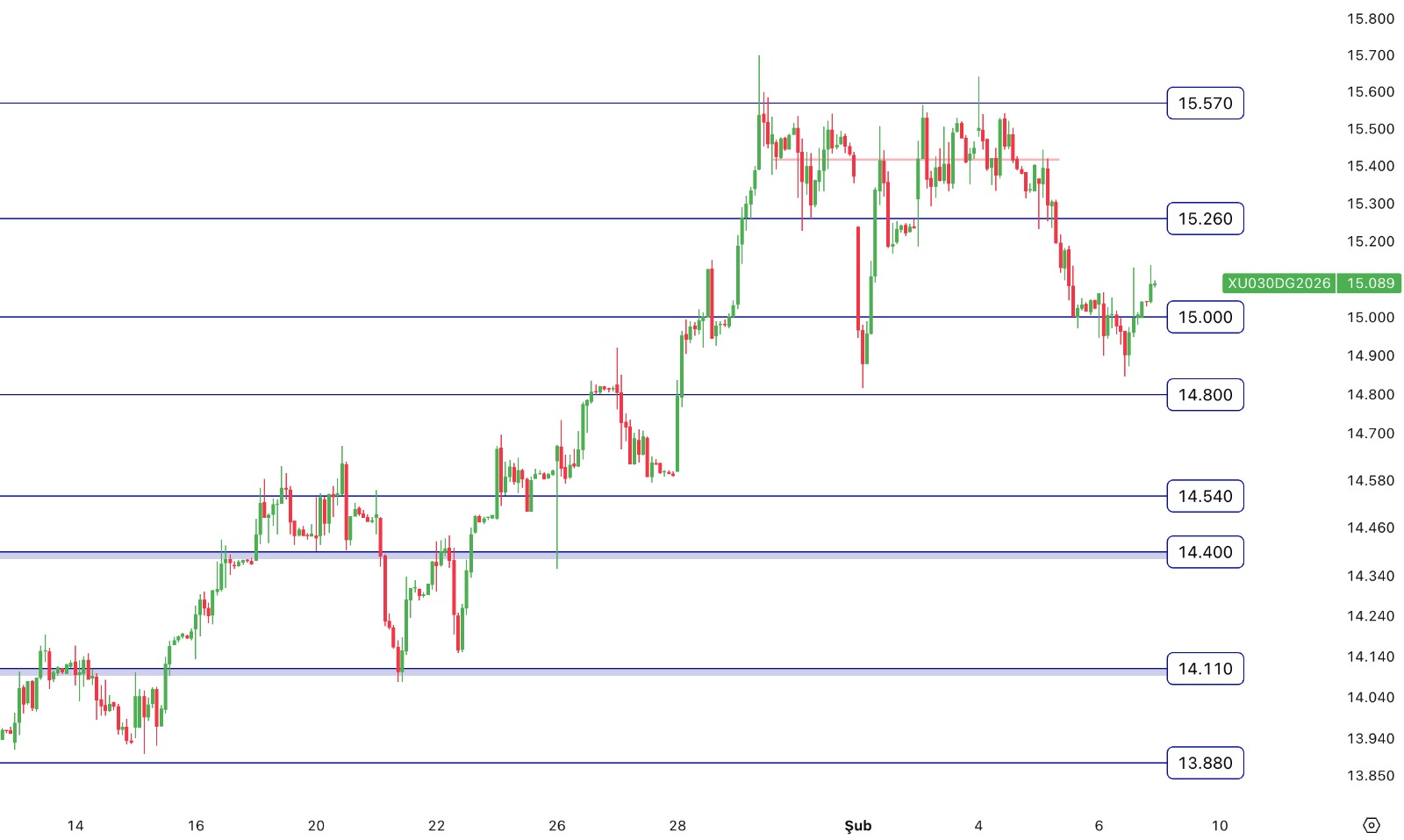- Şubat Vade Endeks Sözleşmesi 14.846,00 – 15.136,00 aralığında hareket ettiği günü %0,13 değer kaybıyla 14.494,00 puan seviyesinden tamamladı.