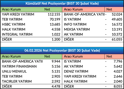 - Şubat Vade Endeks Sözleşmesinde önceki işlem gününde gerçekleşen işlemlerde ilk 5 kurum bazında nette 3.577 adet alış gerçekleşirken, kümülatif net pozisyonlar tarafında ilk 5 kurum bazında 59.855 adet fark ile alışların baskın olduğunu, önceki güne göre ilk 5 kurum bazında farkın alıcılar lehine arttığını gözlemliyoruz. Bir önceki gün ilk 5 kurum bazında fark 54.971 adet alıcılar lehineydi.