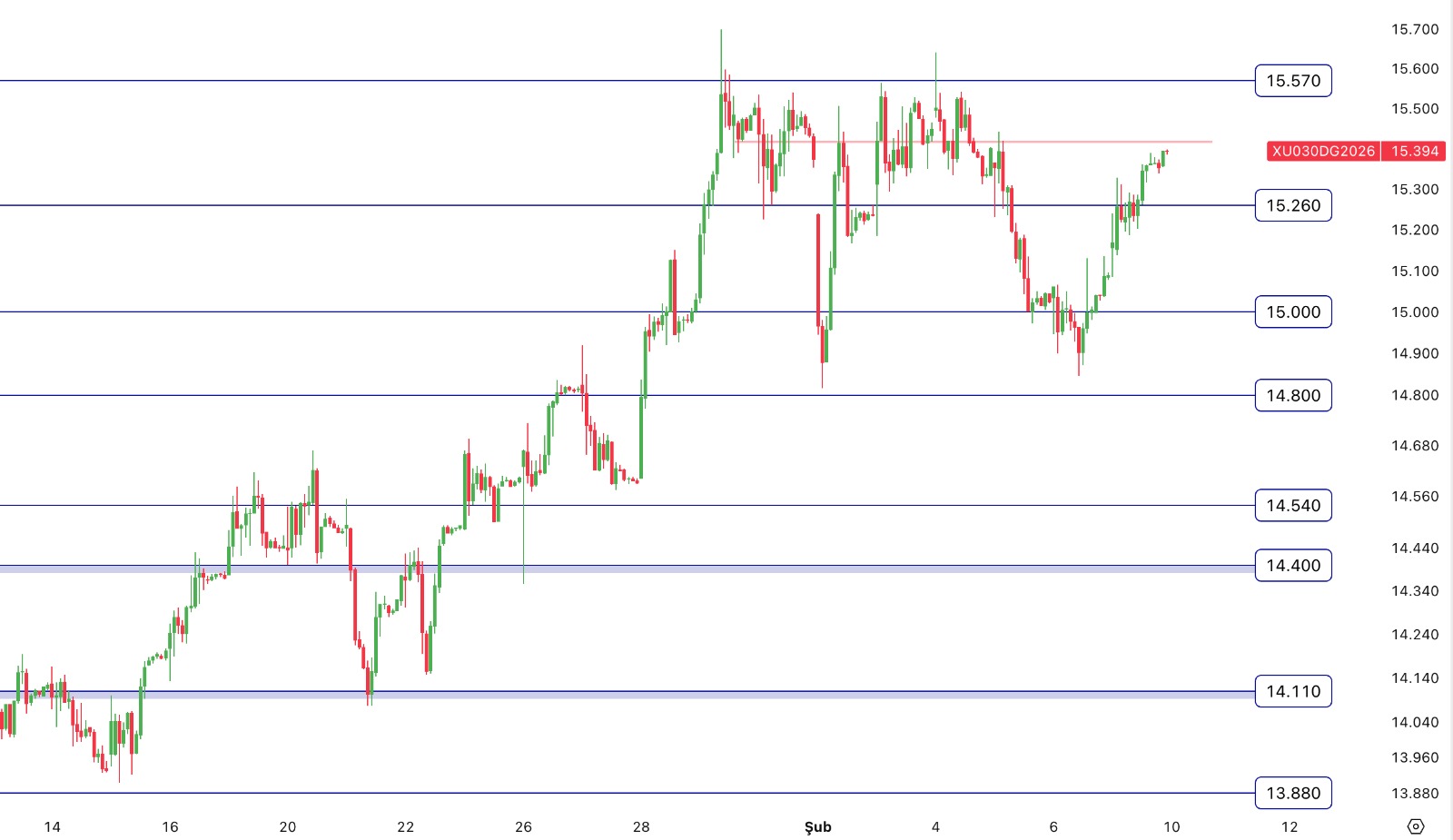 - Şubat Vade Endeks Sözleşmesi 15.084,00 – 15.398,00 aralığında hareket ettiği günü %2,39 değer kazancıyla 15.353,00 puan seviyesinden tamamladı.