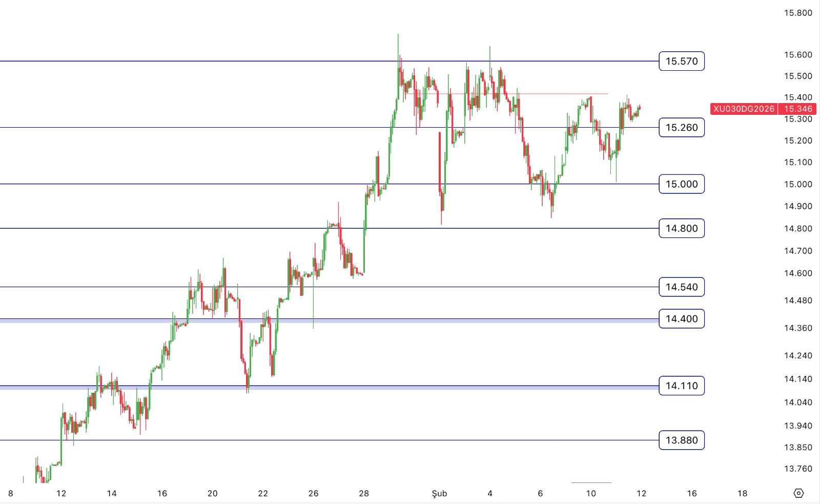 - Şubat Vade Endeks Sözleşmesi 15.008,00 – 15.412,00 aralığında hareket ettiği günü %0,67 değer kazancıyla 15.309,00 puan seviyesinden tamamladı.