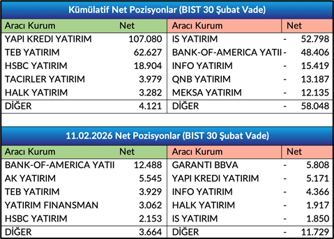 - Şubat Vade Endeks Sözleşmesinde önceki işlem gününde gerçekleşen işlemlerde ilk 5 kurum bazında nette 8.065 adet alış gerçekleşirken, kümülatif net pozisyonlar tarafında ilk 5 kurum bazında 53.927 adet fark ile alışların baskın olduğunu, önceki güne göre ilk 5 kurum bazında farkın alıcılar lehine arttığını gözlemliyoruz. Bir önceki gün ilk 5 kurum bazında fark 50.717 adet alıcılar lehineydi.