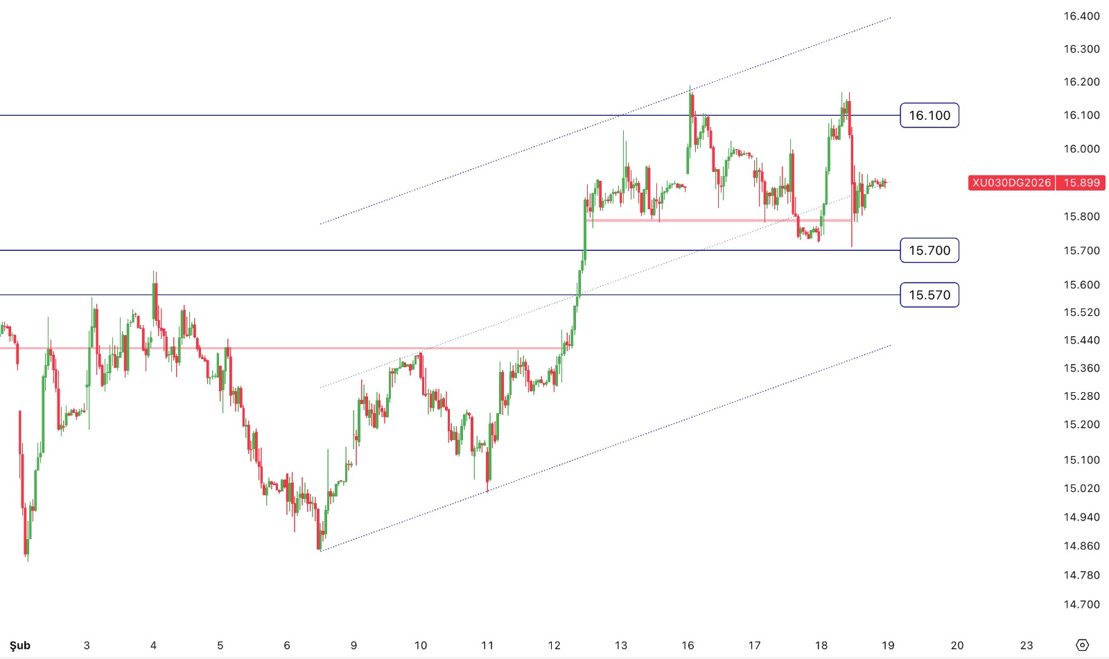 - Teknik olarak değerlendirecek olursak; Şubat Vade Endeks Sözleşmesinin 5 ve 22 günlük ortalamanın üstünde kapanış gerçekleştirdiğini izliyoruz. Sözleşmede kısa vadeli teknik göstergelerin alış yönünde sinyaller verdiğini görüyoruz. Alıcılı seyrin devam etmesi halinde sırasıyla 15.950 ve 16.100 direnç olarak takip edilebilir. Gün içi olası geri çekilmelerde 15.700 ve 15.570 destek olarak takip edilebilir.