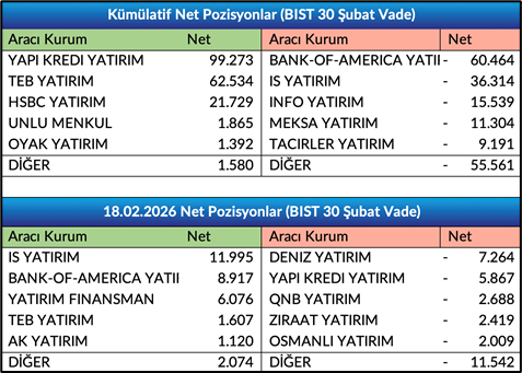 - Şubat Vade Endeks Sözleşmesinde açık pozisyon sayısı 17.304 azalışla 387.381 adete geriledi.Şubat Vade Endeks Sözleşmesinde önceki işlem gününde gerçekleşen işlemlerde ilk 5 kurum bazında nette 9.468 adet alış gerçekleşirken, kümülatif net pozisyonlar tarafında ilk 5 kurum bazında 53.981 adet fark ile alışların baskın olduğunu, önceki güne göre ilk 5 kurum bazında farkın alıcılar lehine arttığını gözlemliyoruz. Bir önceki gün ilk 5 kurum bazında fark 40.804 adet alıcılar lehineydi.