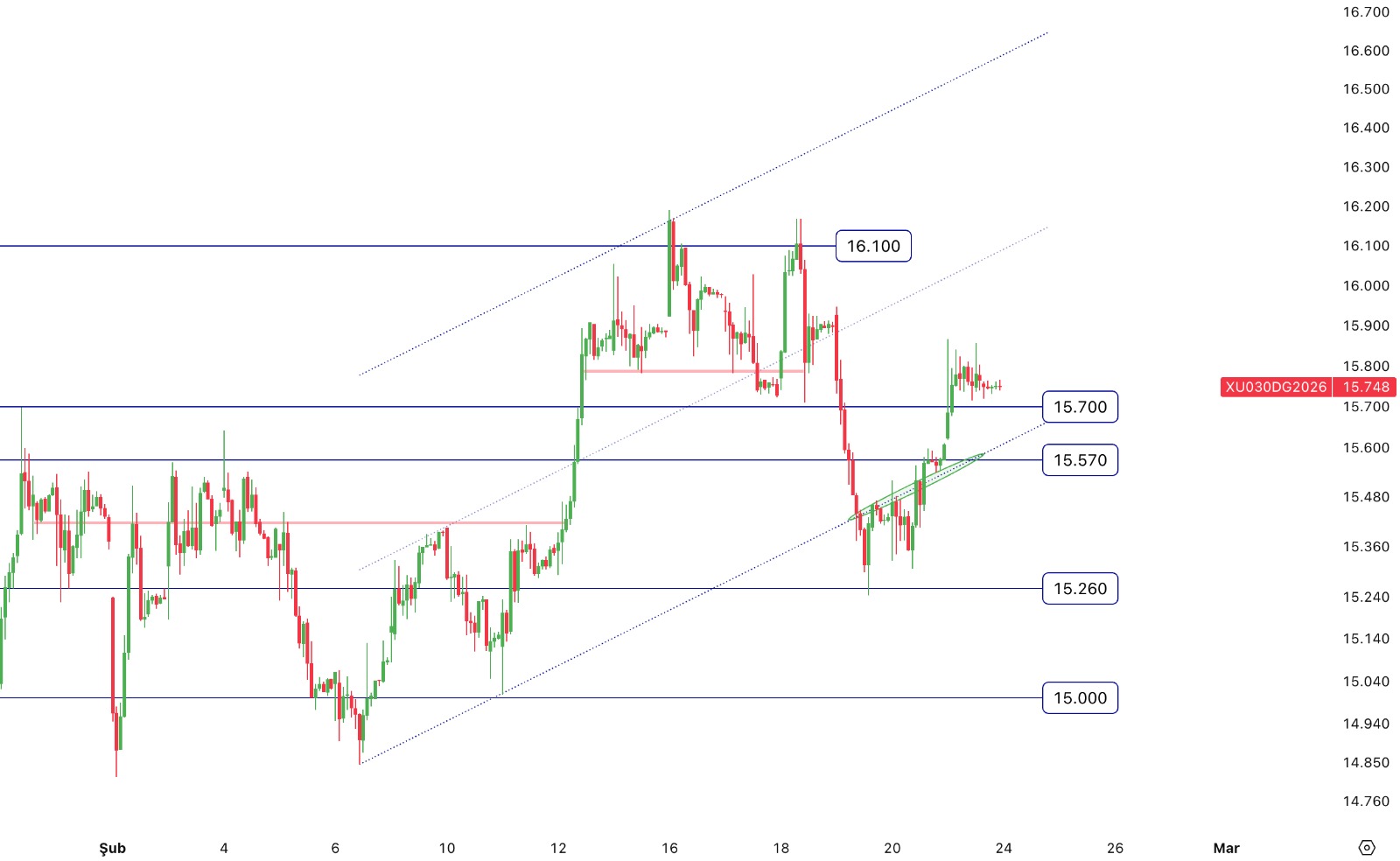 - Şubat Vade Endeks Sözleşmesi 15.619,00 – 15.867,00 aralığında hareket ettiği günü %1,34 değer kazancıyla 15.766,00 puan seviyesinden tamamladı.Teknik olarak değerlendirecek olursak; Şubat Vade Endeks Sözleşmesinin 5 ve 22 günlük ortalamanın üstünde kapanış gerçekleştirdiğini izliyoruz. Sözleşmede kısa vadeli teknik göstergelerin alış yönünde sinyaller verdiğini görüyoruz. Alıcılı seyrin devam etmesi halinde sırasıyla 15.850 ve 16.000 direnç olarak takip edilebilir. Gün içi olası geri çekilmelerde 15.700 ve 15.570 destek olarak takip edilebilir.