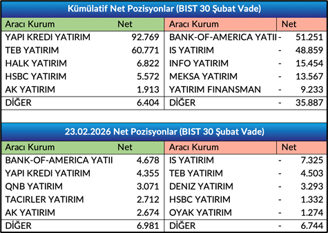 - Şubat Vade Endeks Sözleşmesinde açık pozisyon sayısı 6.364 azalışla 362.469 adete geriledi.Şubat Vade Endeks Sözleşmesinde önceki işlem gününde gerçekleşen işlemlerde ilk 5 kurum bazında nette 237 adet satış gerçekleşirken, kümülatif net pozisyonlar tarafında ilk 5 kurum bazında 29.483 adet fark ile alışların baskın olduğunu, önceki güne göre ilk 5 kurum bazında farkın alıcılar lehine azaldığını gözlemliyoruz. Bir önceki gün ilk 5 kurum bazında fark 35.536 adet alıcılar lehineydi.