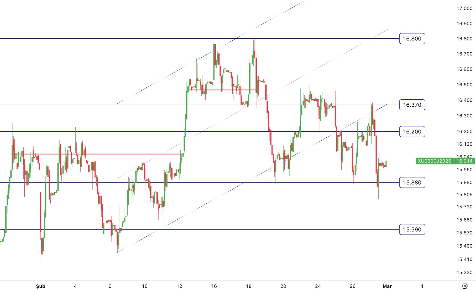 - Nisan Vade Endeks Sözleşmesi 15.776,00 – 16.385,00 aralığında hareket ettiği günü %1,30 değer kaybıyla 15.977,00 puan seviyesinden tamamladı.Teknik olarak değerlendirecek olursak; Nisan Vade Endeks Sözleşmesinin 22 günlük ortalamanın üstünde kapanış gerçekleştirdiğini izliyoruz. Sözleşmede kısa vadeli teknik göstergelerin satış yönünde sinyaller verdiğini görüyoruz. Satıcılı seyrin devam etmesi halinde sırasıyla 15.880 ve 15.590 destek olarak takip edilebilir. Gün içi olası yükselişlerde 16.200 ve 16.370 direnç olarak takip edilebilir.