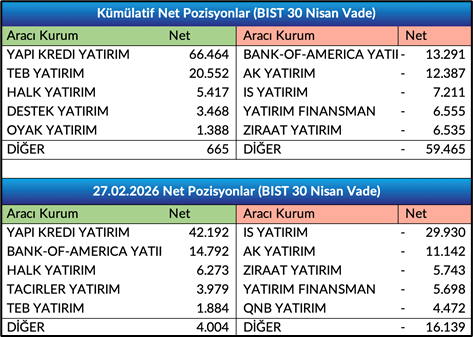- Nisan Vade Endeks Sözleşmesinde açık pozisyon sayısı 64.336 artışla 346.835 adete yükseldi.Nisan Vade Endeks Sözleşmesinde önceki işlem gününde gerçekleşen işlemlerde ilk 5 kurum bazında nette 12.135 adet alış gerçekleşirken, kümülatif net pozisyonlar tarafında ilk 5 kurum bazında 58.800 adet fark ile alışların baskın olduğunu, önceki güne göre ilk 5 kurum bazında farkın alıcılar lehine arttığını gözlemliyoruz. Bir önceki gün ilk 5 kurum bazında fark 28.773 adet alıcılar lehineydi.