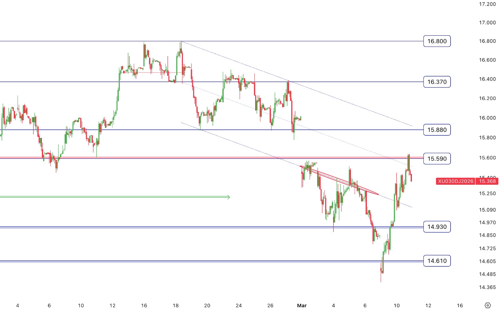 - Nisan Vade Endeks Sözleşmesi 15.086,00 – 15.638,00 aralığında hareket ettiği günü %3,83 değer kazancıyla 15.472,00 puan seviyesinden tamamladı.Teknik olarak değerlendirecek olursak; Nisan Vade Endeks Sözleşmesinin 5 günlük ortalamanın üstünde kapanış gerçekleştirdiğini izliyoruz. Sözleşmede kısa vadeli teknik göstergelerin alış yönünde sinyaller verdiğini görüyoruz. Alıcılı seyrin devam etmesi halinde sırasıyla 15.590 ve 15.880 direnç olarak takip edilebilir. Gün içi olası geri çekilmelerde 15.225 ve 14.930 destek olarak takip edilebilir.