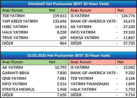 - Nisan Vade Endeks Sözleşmesinde açık pozisyon sayısı 22.643 azalışla 460.781 adete geriledi.Nisan Vade Endeks Sözleşmesinde önceki işlem gününde gerçekleşen işlemlerde ilk 5 kurum bazında nette 2.064 adet alış gerçekleşirken, kümülatif net pozisyonlar tarafında ilk 5 kurum bazında 56.886 adet fark ile alışların baskın olduğunu, önceki güne göre ilk 5 kurum bazında farkın alıcılar lehine azaldığını gözlemliyoruz. Bir önceki gün ilk 5 kurum bazında fark 65.007 adet alıcılar lehineydi.