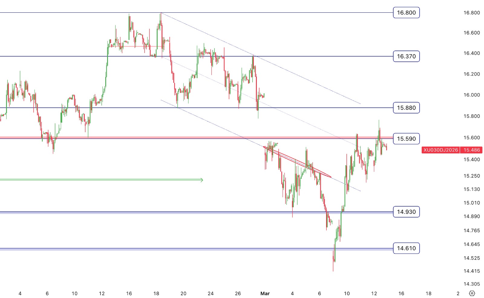 - Nisan Vade Endeks Sözleşmesi 15.286,00 – 15.765,00 aralığında hareket ettiği günü %0,17 değer kazancıyla 15.519,00 puan seviyesinden tamamladı.Teknik olarak değerlendirecek olursak; Nisan Vade Endeks Sözleşmesinin 5 günlük ortalamanın üstünde kapanış gerçekleştirdiğini izliyoruz. Sözleşmede kısa vadeli teknik göstergelerin alış yönünde sinyaller verdiğini görüyoruz. Alıcılı seyrin devam etmesi halinde sırasıyla 15.590 ve 15.880 direnç olarak takip edilebilir. Gün içi olası geri çekilmelerde 15.225 ve 14.930 destek olarak takip edilebilir.