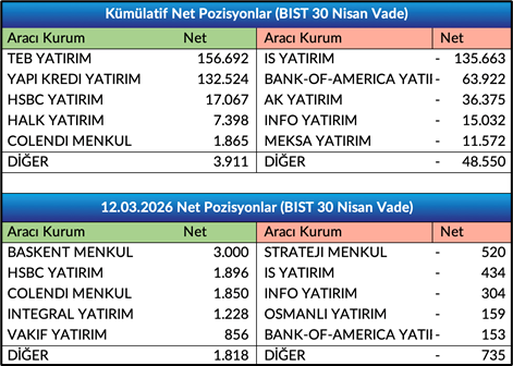- Nisan Vade Endeks Sözleşmesinde açık pozisyon sayısı 2.033 azalışla 455.472 adete geriledi.Nisan Vade Endeks Sözleşmesinde önceki işlem gününde gerçekleşen işlemlerde ilk 5 kurum bazında nette 1.083 adet satış gerçekleşirken, kümülatif net pozisyonlar tarafında ilk 5 kurum bazında 44.639 adet fark ile alışların baskın olduğunu, önceki güne göre ilk 5 kurum bazında farkın alıcılar lehine azaldığını gözlemliyoruz. Bir önceki gün ilk 5 kurum bazında fark 50.727 adet alıcılar lehineydi.