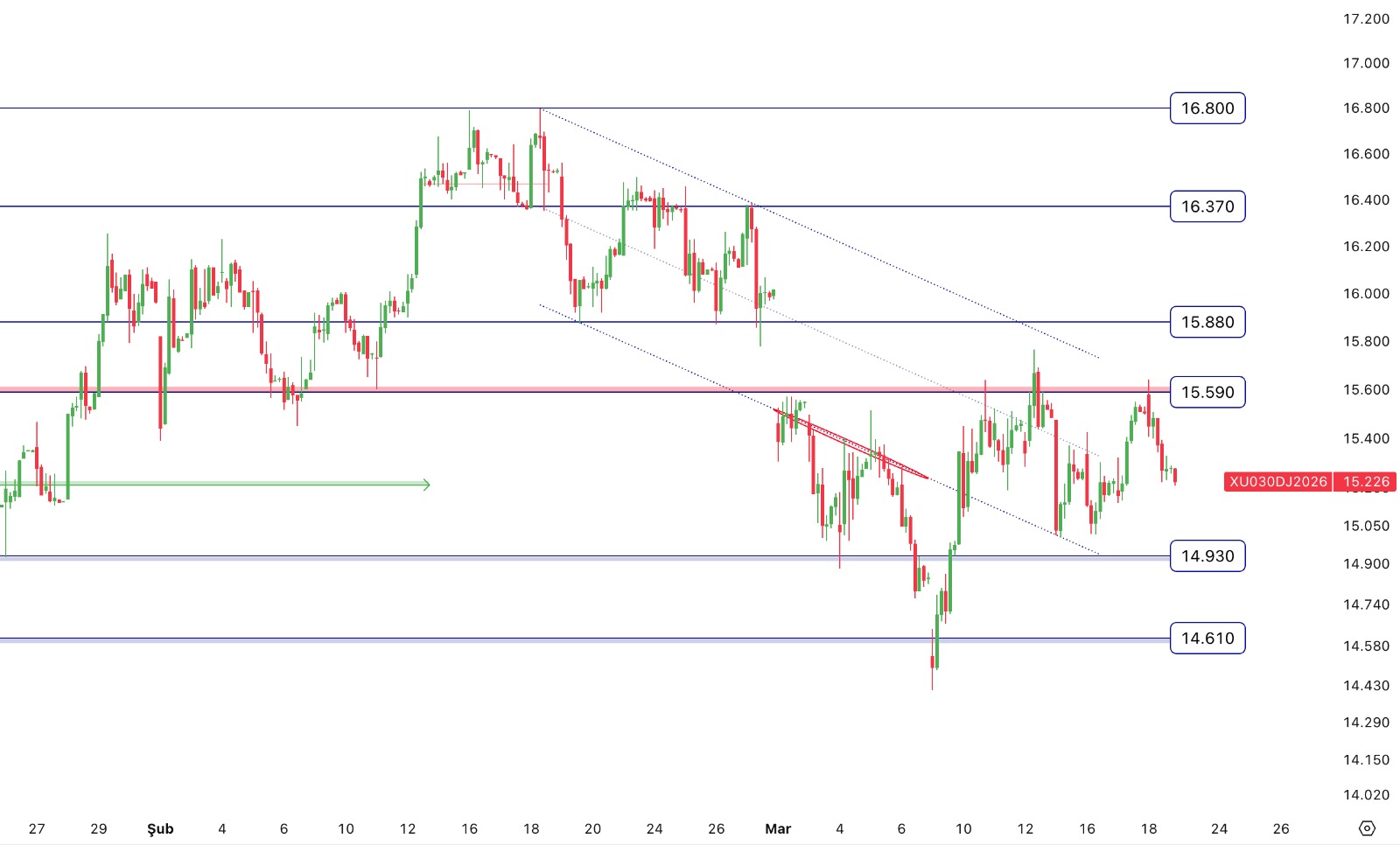 - Nisan Vade Endeks Sözleşmesi 15.209,00 – 15.640,00 aralığında hareket ettiği günü %1,35 değer kaybıyla 15.311,00 puan seviyesinden tamamladı. Teknik olarak değerlendirecek olursak; Nisan Vade Endeks Sözleşmesinin 5 ve 22 günlük hareketli ortalamanın altında kapanış gerçekleştirdiğini izliyoruz. Sözleşmede kısa vadeli teknik göstergelerin satış yönünde sinyaller verdiğini görüyoruz. Satıcılı seyrin devam etmesi halinde sırasıyla 15.225 ve 14.930 destek olarak takip edilebilir. Gün içi olası yükselişlerde 15.590 ve 15.880 direnç olarak takip edilebilir.